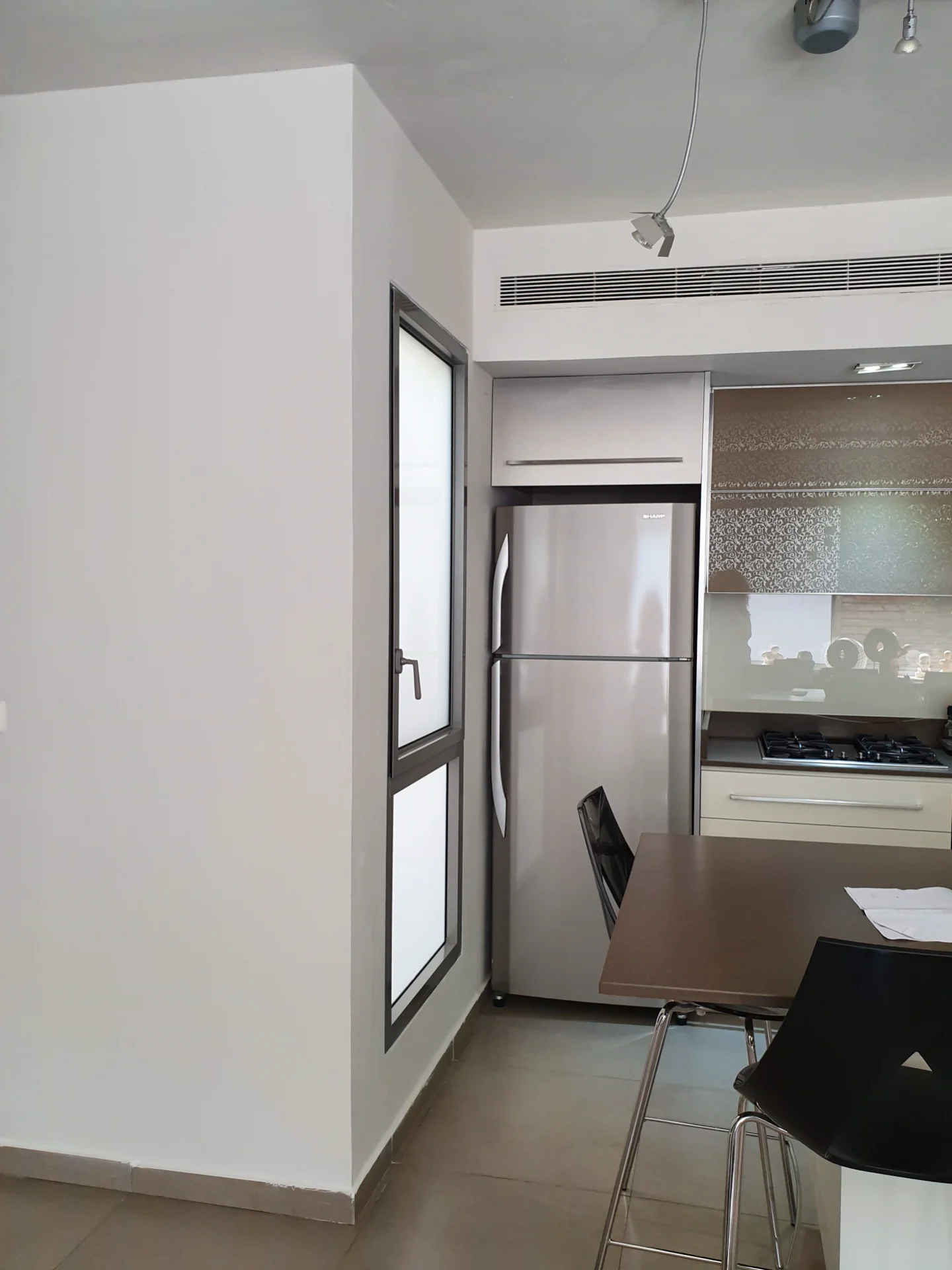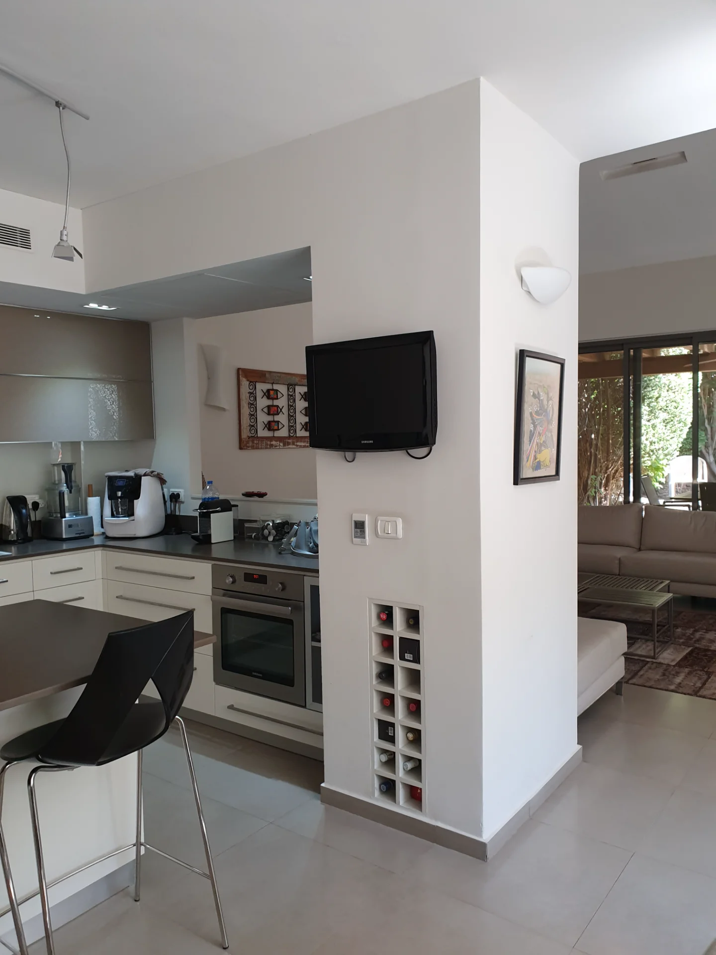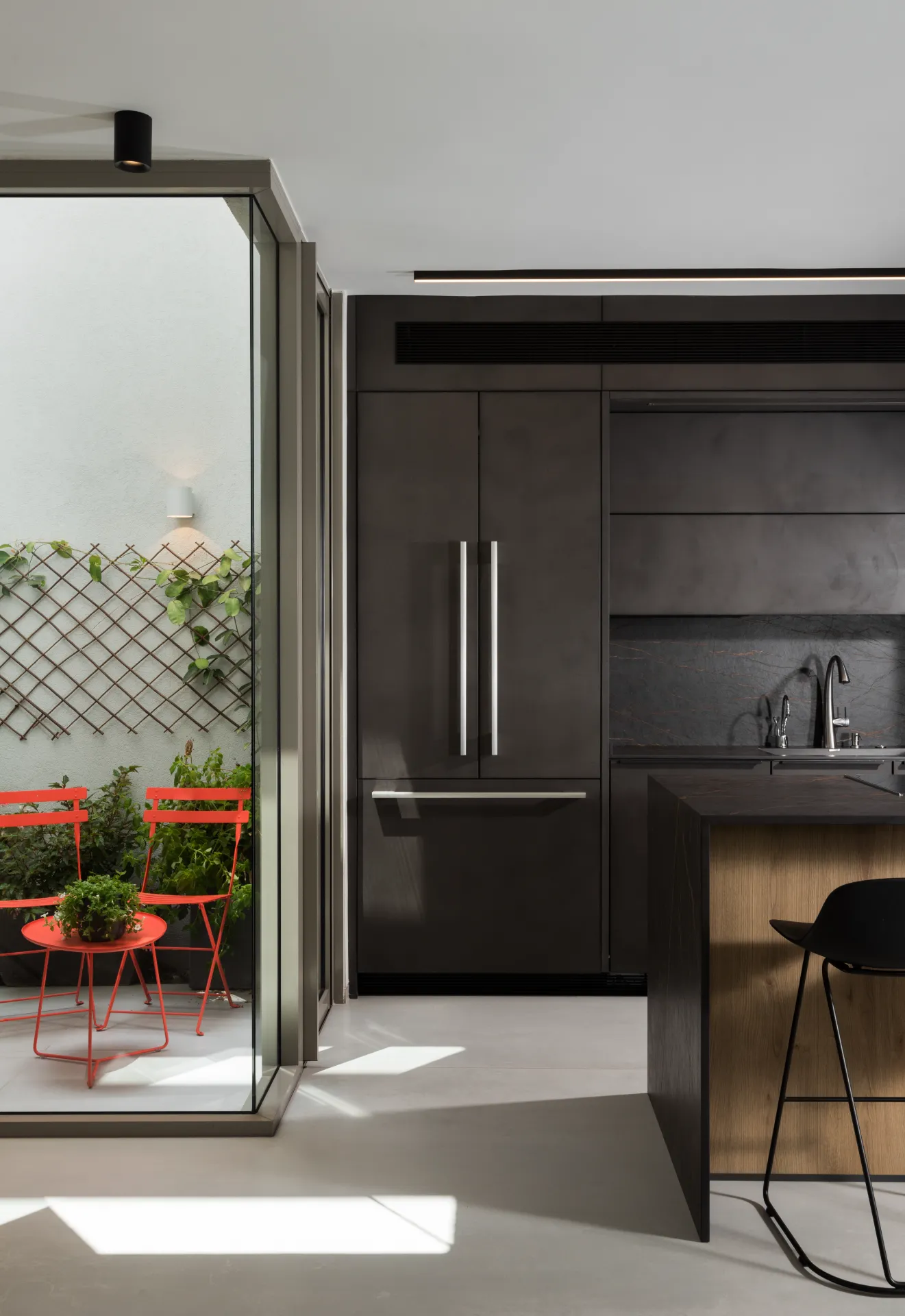 סגירת פיר אוויר ישן ע"י יציקת רצפה חדשה במפלס הקרקע, פתיחת קיר זכוכית ענק עם דלת כיס, ליצירת מעבר טבעי ונוח בין המטבח לפטיו החדש.