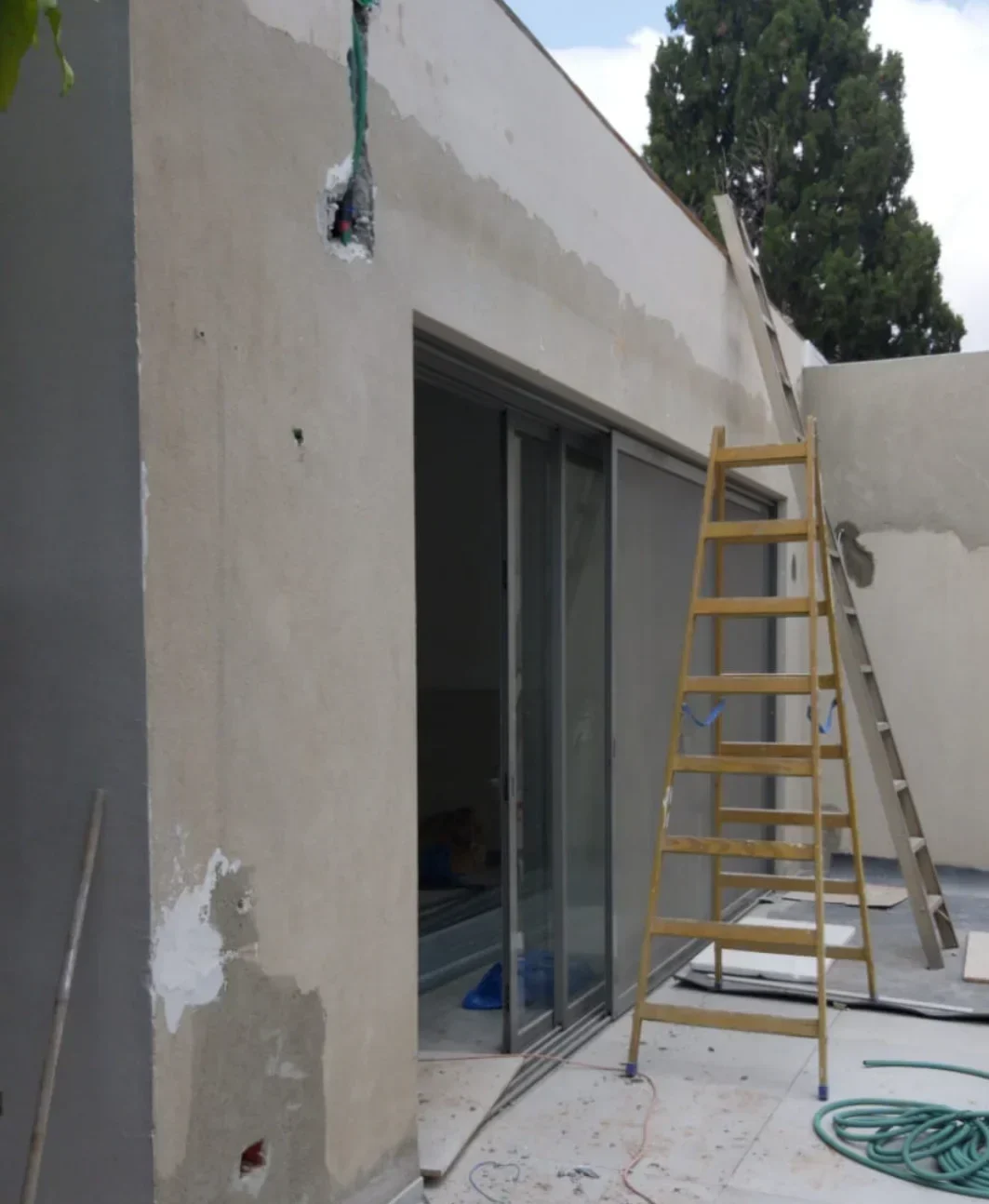 איטום מלא לקירות חוץ לפני טיח עם רשת טיח, חפירות היקפיות ואיטום מחודש של יסודות המבנה למניעת בעיות רטיבות עתידיות וחדירת מים.