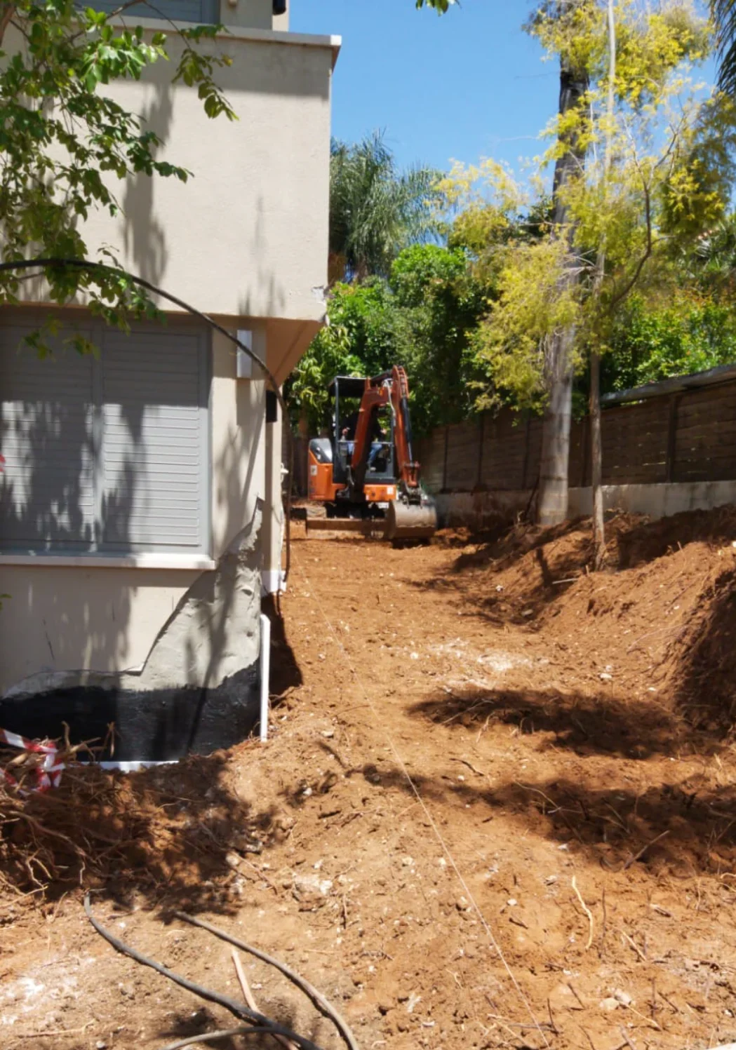 פירוק מלא של החצר, שבילי הגישה, המדרגות והתשתיות הקיימות, שימוש בכלים כבדים לביצוע הריסות נקודתיות בצורה מדויקת.